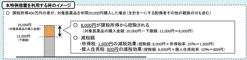 分かりにくい文章ですが、とても簡単に伝えると「健康管理をちゃんとしている人が、ドラッグストアなどで市販薬を年間12,000円より多く買ったときに、税金が安くなる制度」となります。
