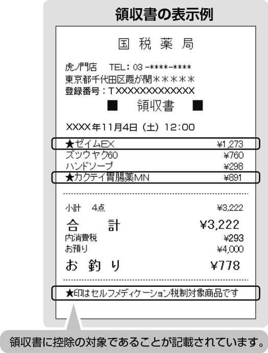 セルフメディケーション税制の対象となる商品には、購入の際のレシートや領収書等にセルフメディケーション税制の対象商品である旨が表示されています。