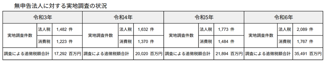 法人税、消費税ともに、無申告法人への実地調査件数は4年連続で増加しています 。